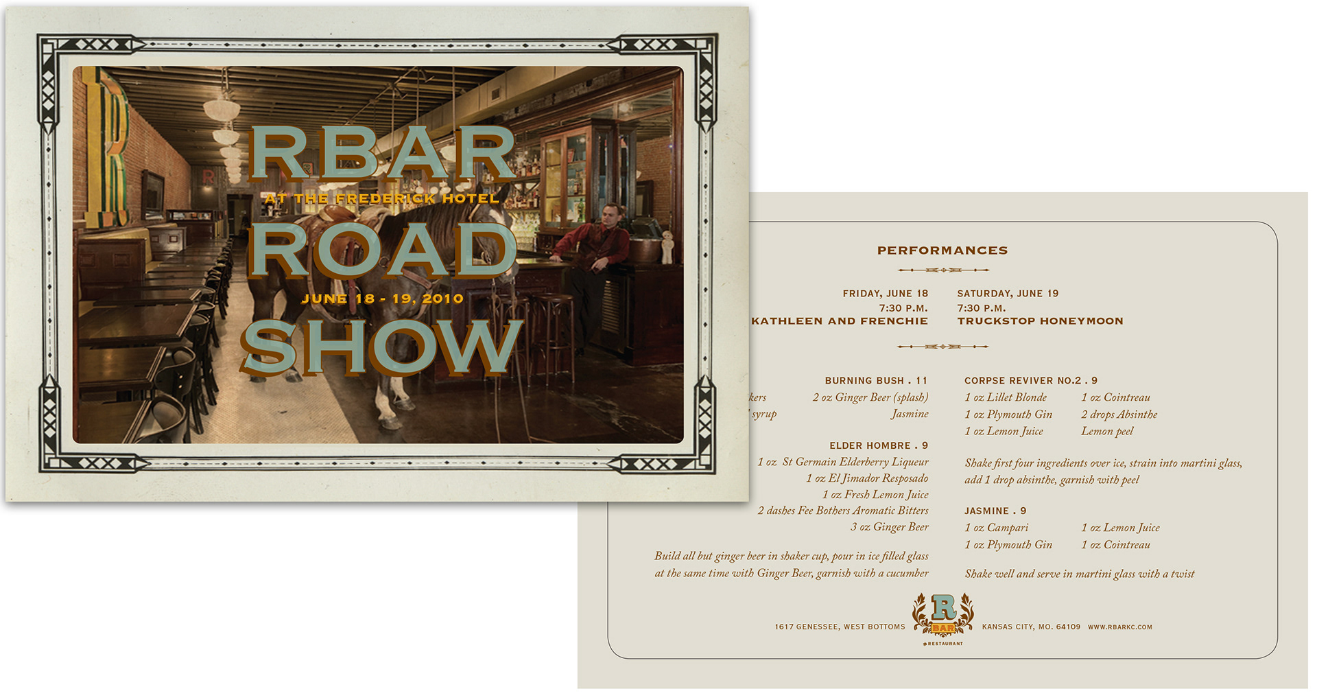Identity and collateral created for a local Kansas City bar and restaurant that specializes in hand-crafted cocktails, seasonal American food and nightly local music.